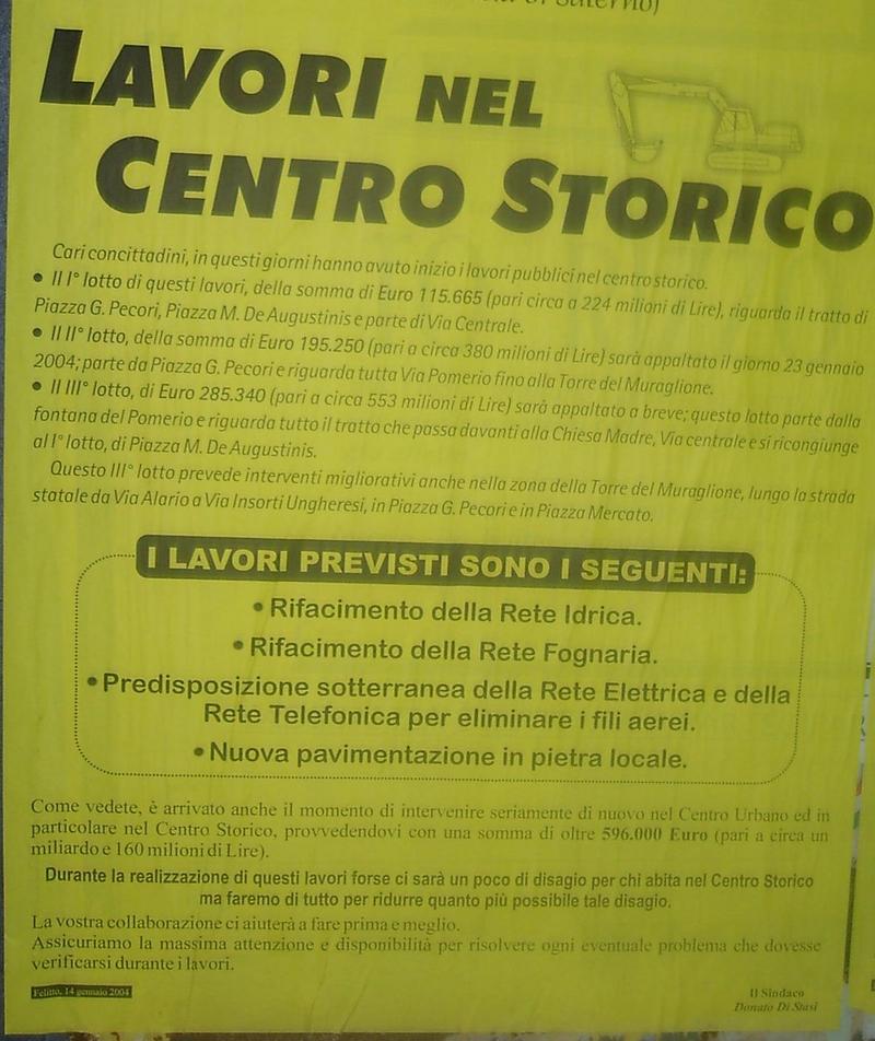 manifesto Nel manifesto si parla di lavori in corso nel centro storico. Prima di tutto dobbiamo fare i complimenti all'Amm.C. per i lavori che sta portando avanti in questi ultimi mesi.
