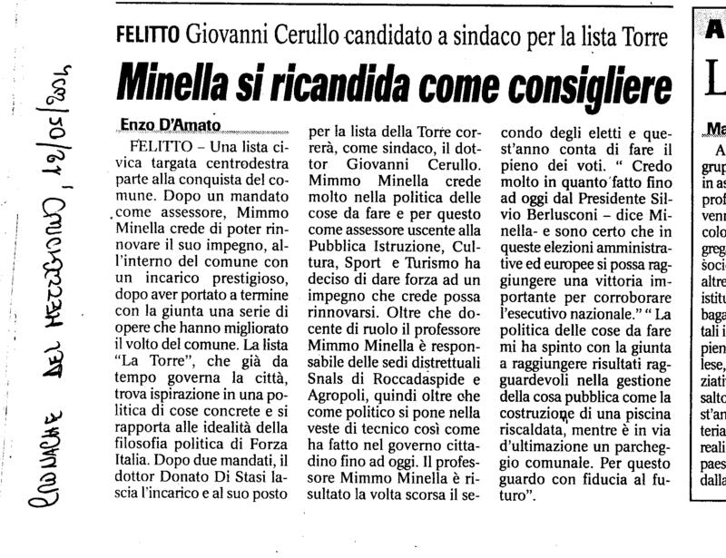 Recentemente è apparso su "Cronache del mezzogiorno" (il 12/05/2004) un articolo sulla ricandidatura di Mimmo Minella. Per leggere dall'estratto del giornale clicca qui.